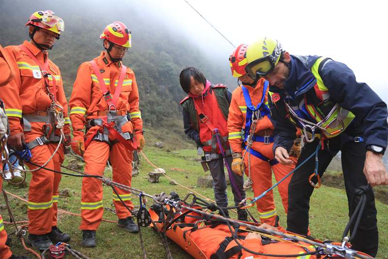 首次——外國“和尚”來念山地救援經。本次活動邀請了2名法國國家憲兵登山和滑雪培訓中心的山岳救援專家為我市各縣區消防部隊的24名骨干進行培訓。培訓內容以山地救援中涉及的繩索使用操作、救援裝備使用操作、巖壁救援技術、索道救援技術等科目為主。消防支隊趙璐支隊長表示:“近年來,我市地震等自然災害頻發、山岳救援任務繁重,野外探險登山活動也日益頻繁。我市山岳救援特別是消防部隊救援任務越來越重,這就要求救援人員具備專業的高空救援和復雜的山岳地形救援能力。此次消防支隊抓住中法實施警務合作計劃的機遇,主動邀請全球領先的法國憲兵山岳救援專家來昭進行全面系統培訓,是我市首次邀請外國救援專家來昭培訓。目的就是要昭通消防部隊學習法國山岳救援技術之長,補齊自身技術短板,形成一套系統的山岳救援體系。”
