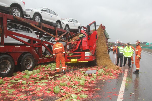 現場指揮員員根據事故現場情況,立即下達作戰命令:救援一組配合現場交警實施警戒,防止次生災害發生;救援二組人員攜帶液壓剪切鉗、頂桿、擔架等破拆工具到達現場實施救援;救援三組由1名戰士對被困人員進行交談,穩定其情緒。隨著指揮員命令的下達,各小組迅速展開工作。這時,天空下起了大雨,無疑給救援工作增加了難度。但這并不影響救援工作的展開,救援二組人員,首先發現一名被困人員被西瓜掩埋,立即進行施救。遺憾的是,經現場醫護人員確認,被掩埋的被困人員,已無生命特征。然而傳來被困人員呼救聲,尋聲發現被困人員被夾住了。指揮員斟酌后,先對呼救被困人員進行施救。救援人員立即利用破拆工具對被困人員進行救援,在施救過程中不斷安撫被困人員情緒,系配合救援工作。7時40分,成功把被困人員救出,并交由現場醫護人員實施救治。這時,救援人員對掩埋在西瓜堆里的被困人員進行施救,卻發現該被困人員肚子破裂。7時50分,殯儀館車到達現場,經殯儀館工作人員與消防官兵聯合作戰,終于把被困人員救出。指揮員下令收整器材歸隊,并轉交手中的清理工作,至此,整個救援行動圓滿結束。