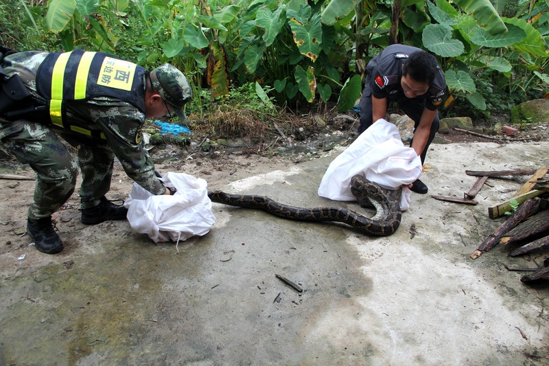 &ldquo;緝拿歸案&rdquo; 好大的&ldquo;兇手&rdquo; 抓捕行動 收兵 將蟒蛇放生。