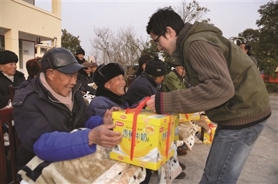 徐瑞志在給老人發放牛奶、毛毯。 張耀西 攝春節前夕,泗陽縣城廂 ... [更多詳細]