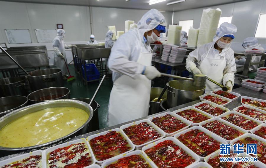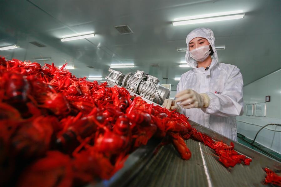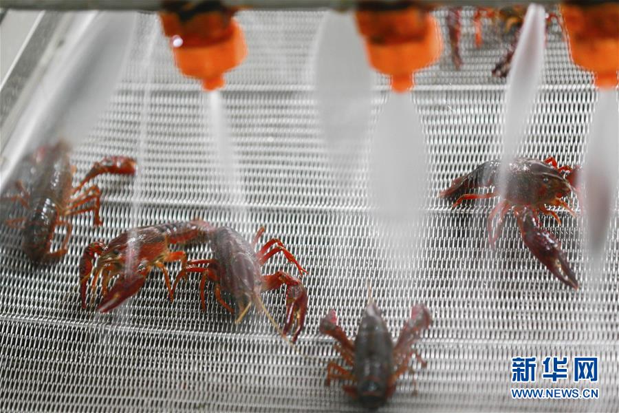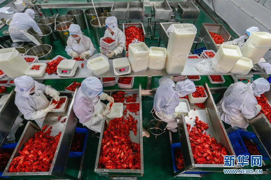 6月4日,江蘇省盱眙縣泗州城小龍蝦加工公司的工人在生產(chǎn)線上作業(yè)。地處江蘇中部的淮安市盱眙縣是我國著名的“龍蝦之鄉(xiāng)”。近年來,當(dāng)?shù)夭粩嚅_拓市場,在產(chǎn)品創(chuàng)新和冷鏈物流方面提檔升級,生產(chǎn)的小龍蝦產(chǎn)品在供應(yīng)國內(nèi)市場的同時(shí),出口澳大利亞、馬來西亞等國家和地區(qū),年產(chǎn)值超百億元。