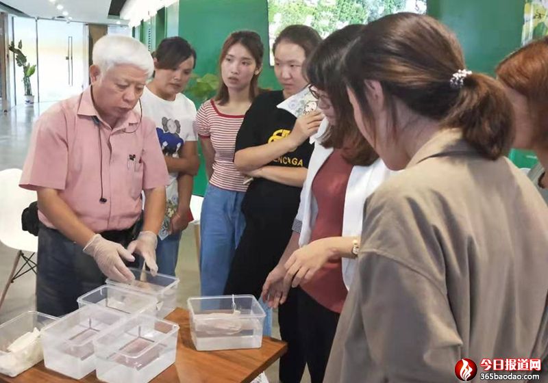臺灣愛玉推廣協會理事長、愛玉果膠萃取機的發明人&mdash;&mdash;謝宗欽先生(左一)現場為參觀者做示范講解如何制作&ldquo;愛玉&rdquo;果凍 2019年8月 ... [更多詳細]