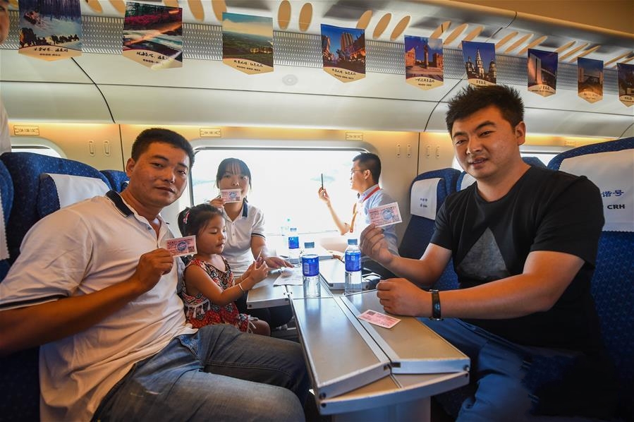 8月3日,在呼和浩特東站開往烏蘭察布的列車上,乘客們在展示加蓋紀念印章的車票。  當日上午10時18分,內蒙古首列高鐵D6980次列車伴隨著嘹亮的汽笛聲,駛 ... [更多詳細]
