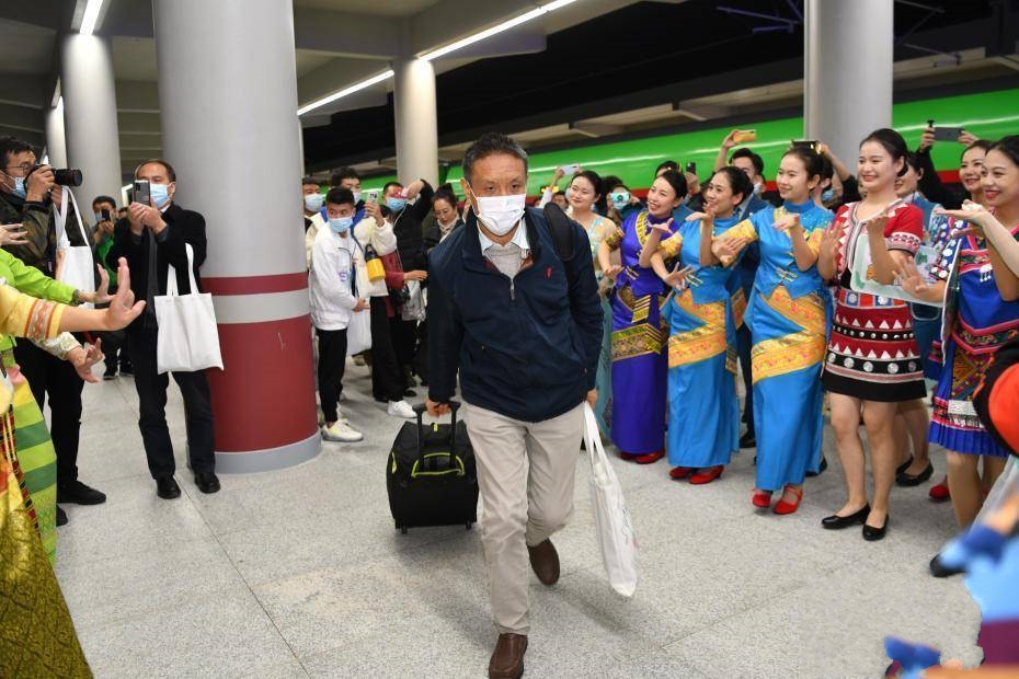 12月3日,中老鐵路全線開通運營,西雙版納傣族自治州舉行具有民族特色的歡迎儀式,迎接首批乘坐首發列車的旅客抵達西雙版納景洪市。圖為身著民族服裝的列車員向 ... [更多詳細]
