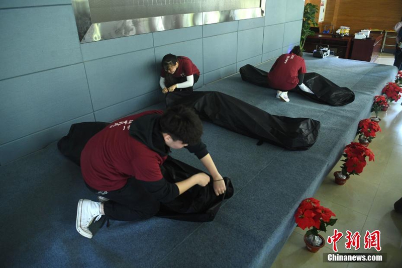 4月7日,以“感悟生命感恩生命”為主題的生命教育體驗活動在位于重慶市沙坪壩區的四川外國語大學校園內舉行。學生們通過“孕育體驗”、“殘障體驗”“死亡體驗”等,表達對逝去親人的感謝與思念,從中去感悟生命的意義。圖為圖為大學生躺“裹尸袋”體驗“死亡” 。