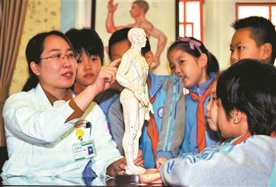 10月21日,在石家莊市橋西區振頭社區衛生服務中心的國醫堂,醫務人員向小學生介紹人體穴位知識。當日,河北石家莊市橋西區振頭小學的學生來到社區衛生服務中心 ... [更多詳細]