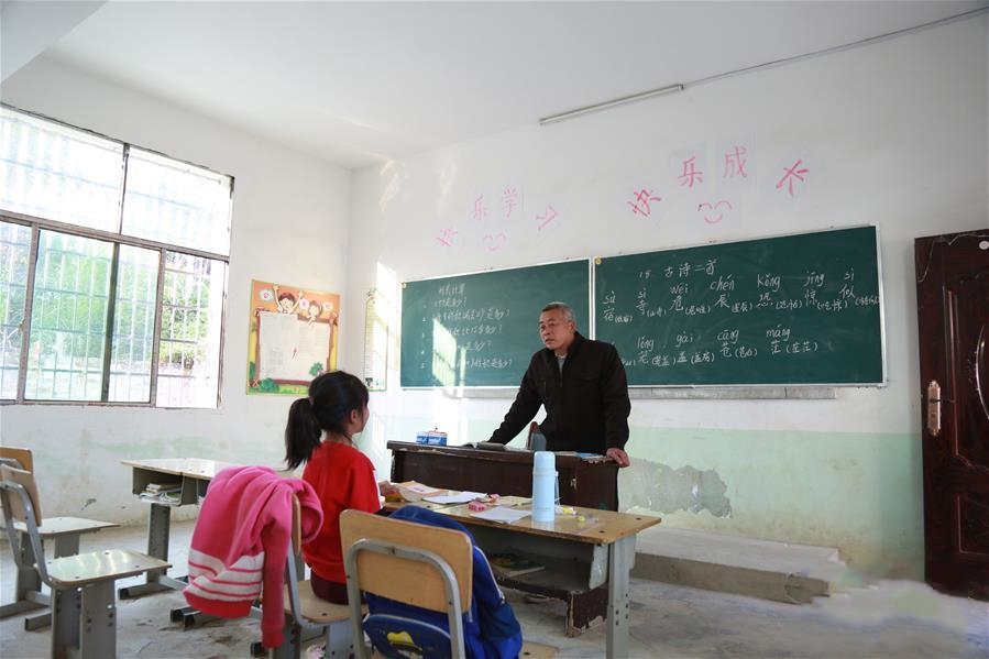11月29日,在湖南省永州市冷水灘區黃陽司鎮天里坪村小學教學點,55歲的唐炳元在給7歲的陳宏薈上課,該教學點只有一名老師一名學生。 55歲的唐炳元已是滿頭白發 ... [更多詳細]