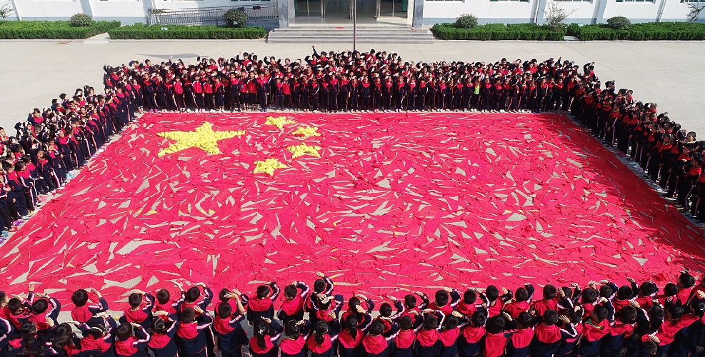 2018年9月28日,山東臨沂,沂南縣張哨中心小學師生用1500條紅領巾和150頂小黃帽,按照國旗的比例,拼成15米長、10米寬的“巨幅國旗” ... [更多詳細]