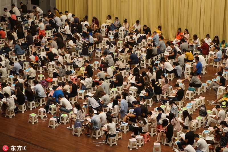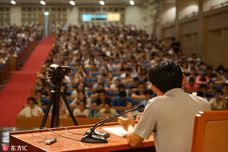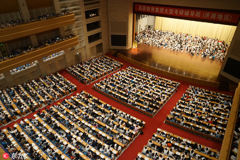 2017年7月31日,山東濟南,漫漫考研路,考研族老師上課,場面十分壯觀,座位上座無虛席,沒有座位的同學坐在舞臺上臨時的座椅上課認真記筆記。休息時間,同學們帶上耳機和眼罩或趴或靠著椅子休息睡覺補充精力。舞臺左側的老師被學生們包圍著。