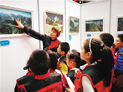 圖為小朋友們觀看展覽時聽輔導員講解冰川知識