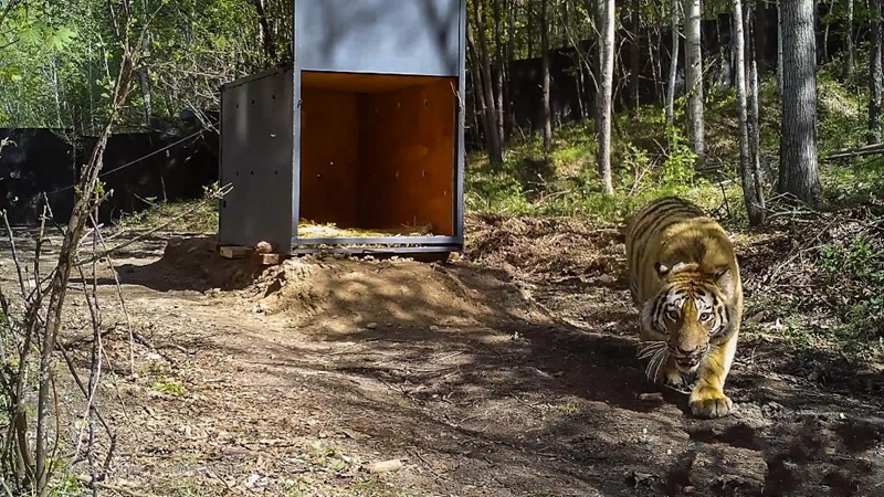 5月18日,在黑龍江省穆棱林業(yè)局有限公司林場(chǎng),被放歸自然的野生東北虎從鐵箱子里走出(視頻截圖)。     5月18日,在黑龍江省穆棱林業(yè)局有限公司 ... [更多詳細(xì)]