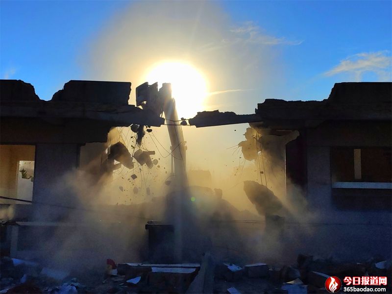8月24日,夕陽西下,在山東省郯城縣馬頭鎮二劉莊村拆遷現場。透過陽光,一臺破碎混凝土的挖掘機場景與天空一片云彩交相呼應,構成了一幅幅美麗圖畫。(高軍 ... [更多詳細]