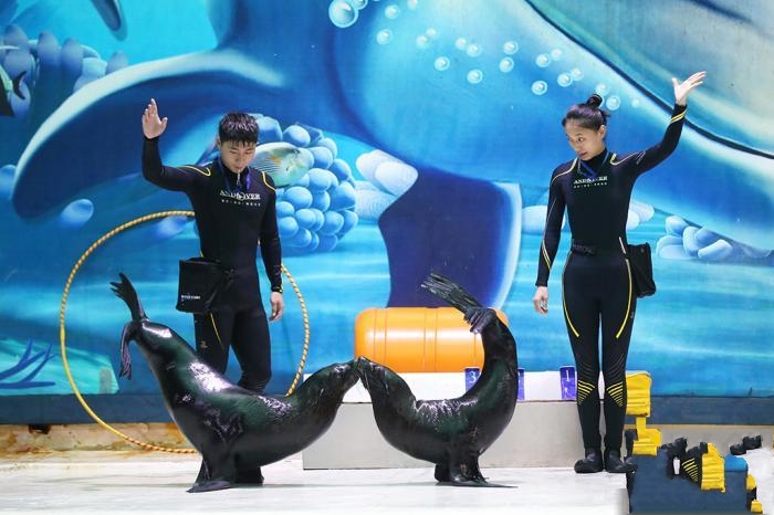 陳琳(右)和李蘇雨帶著海獅兄弟麥迪和卡特(左)登臺表演。卡特是哥哥,今年四歲,非澳毛皮海獅;麥迪是弟弟,今年三歲,南美毛皮海獅。 泱波 攝這看似簡單的飼 ... [更多詳細]