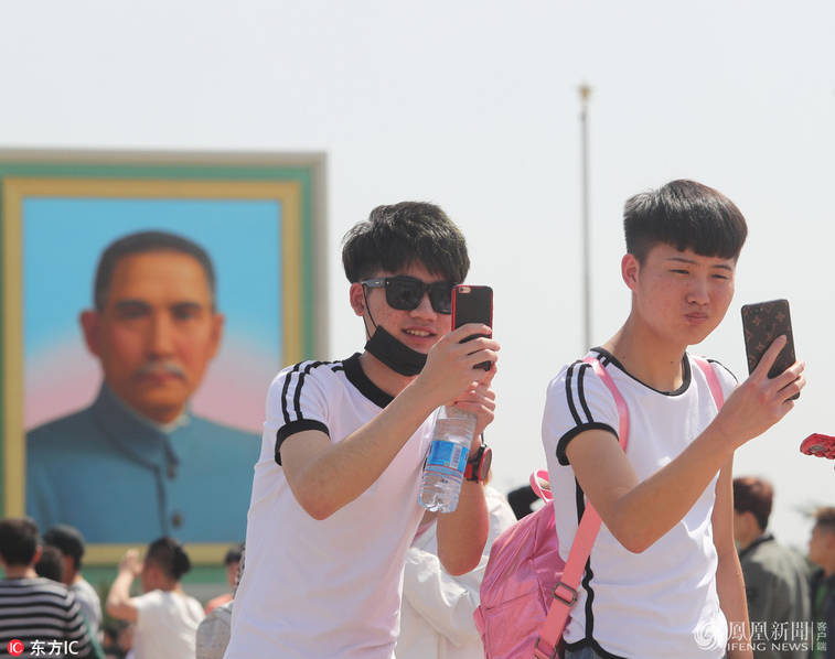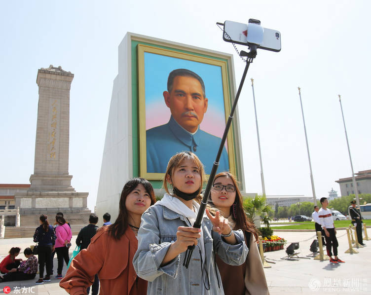 2018年4月27日,北京,游客紛紛在孫中山畫像前拍照留影。當(dāng)天,孫中山巨幅畫像亮相天安門廣場,迎接即將到來的五一國際勞動節(jié)。 游客在孫中山畫像前拍照留影
