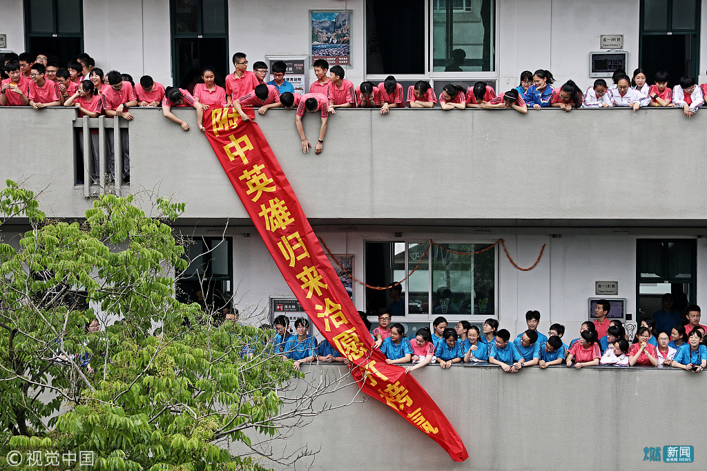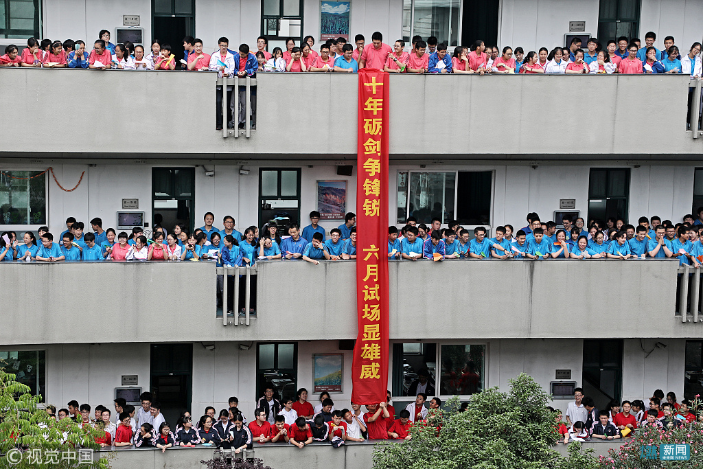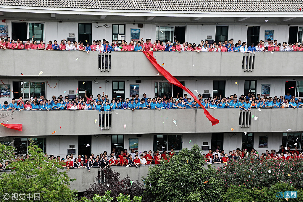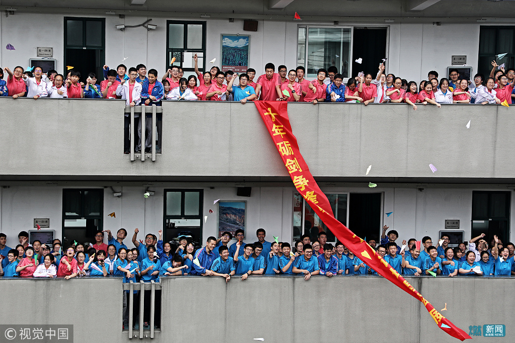 2018年6月5日,杭州,浙大附中高一高二的1000余名學(xué)生集體喊樓,放飛寫滿祝福語的五彩紙飛機(jī),為即將高考的學(xué)長(zhǎng)學(xué)姐鼓勁加油。