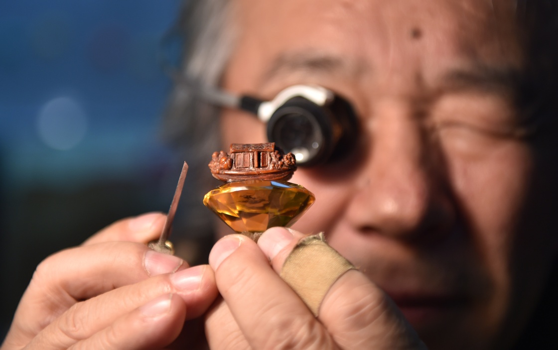 12月12日,韓志耀在工作室挑選雕刻需用的桃核。新華社記者 錢一 攝  大連核雕是一門古老的民間技藝,是在傳統工筆雕刻的基礎上脫胎而出的寫意雕刻,于201 ... [更多詳細]