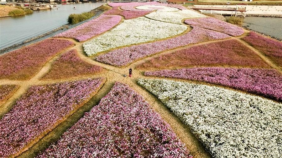 10月12日清晨,在安徽省巢湖市中廟街道,音樂愛好者在巢湖岸邊的一處花海里唱歌(無人機拍攝)。 晨光中的安徽巢湖風景秀美,如同畫卷一般。   這是晨 ... [更多詳細]
