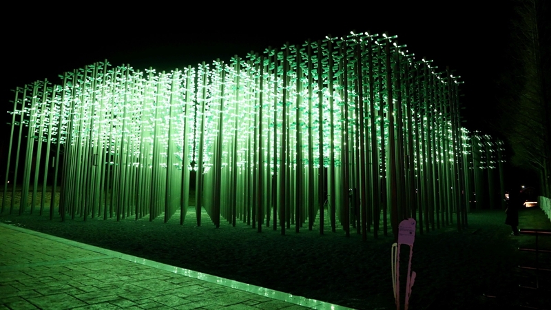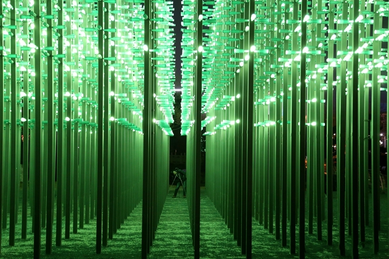 遠處與城市樓宇光效遙相呼應,近處與湖水樹木相映成趣,游人置身其間則如入奇異幻境。