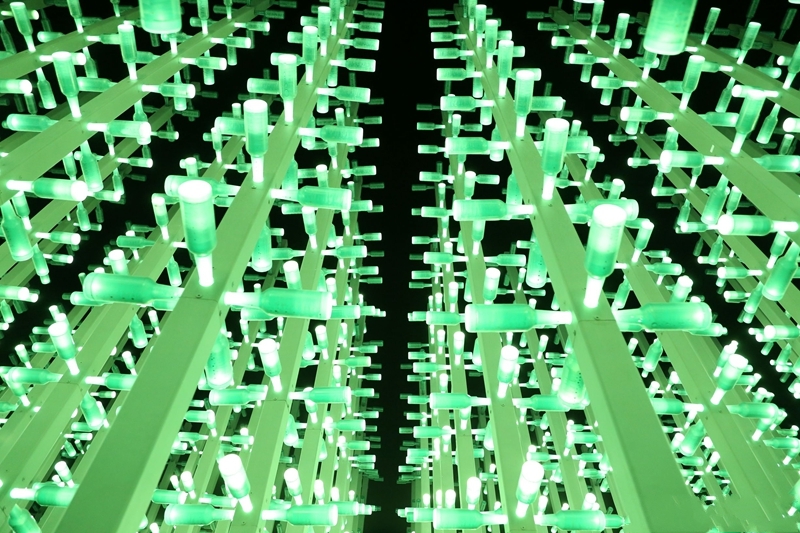 據悉,這片占地約兩百平米,由千余根 “啤酒樹”組成的“啤酒叢林”。伴著舒緩的背景音樂,由鋼立柱制作而成的“瓶酒樹”上30000余個塑料啤酒瓶受互動光作用。