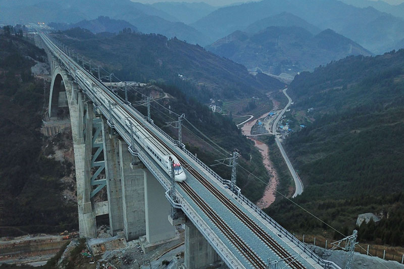 1月11日,一列動(dòng)車(chē)組測(cè)試列車(chē)駛過(guò)夜郎河大橋。 經(jīng)過(guò)5年多艱苦建設(shè),世界首例&ldquo;貫入式大體積嵌巖拱座基礎(chǔ)&rdquo;大橋&mdash;&mdash;夜郎河特大橋近日落成, ... [更多詳細(xì)]