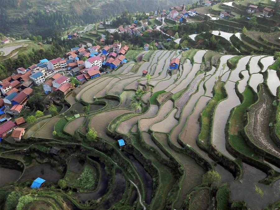 貴州省錦屏縣固本鄉(xiāng)東莊村苗寨春色(4月6日無(wú)人機(jī)拍攝)。春日時(shí)節(jié),地處貴州省黔東南苗族侗族自治州錦屏縣固本鄉(xiāng)大山深處的東莊苗寨春意盎然,梯田雨水充盈, ... [更多詳細(xì)]