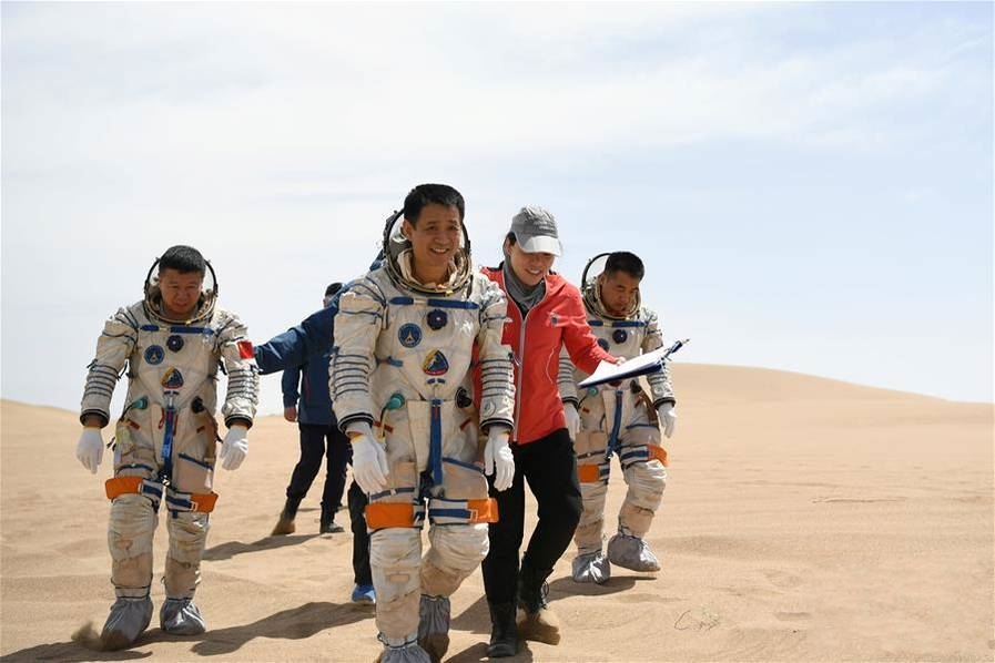 2018年5月17日,航天員聶海勝(右三)、劉旺(左一)和張曉光(右一)在工作人員護(hù)送下前往沙漠進(jìn)行野外生存訓(xùn)練。15名中國(guó)航天員日前在巴丹吉林沙漠圓滿完成了 ... [更多詳細(xì)]