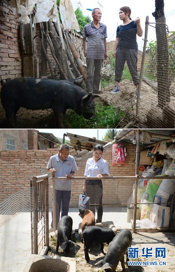 這是一張拼版照片,上圖為:張文妮(右)在榆樹村村民楊春芳家查看黑豬養殖情況(2016年7月28日攝);下圖為:張文妮(右)查看楊春芳家改造擴大后的豬舍,黑豬數量已由2016年的兩頭變為現在的四頭(6月22日攝)。