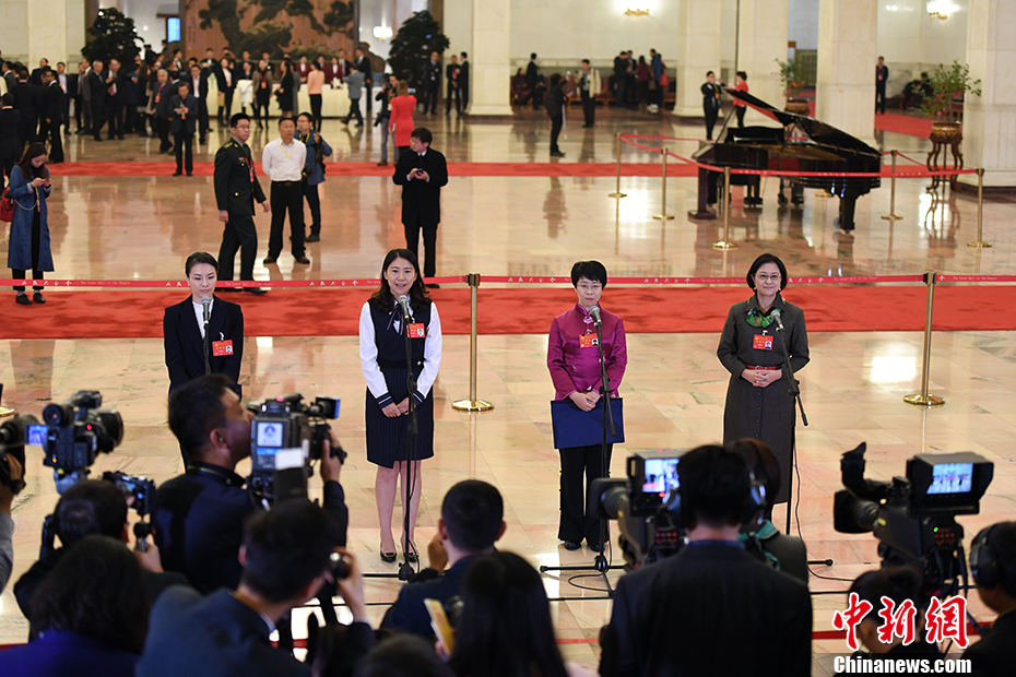 十九大代表盧麗安(右一)、蒙曼(右二)、杜玉濤(右三)、吳敏霞接受采訪。