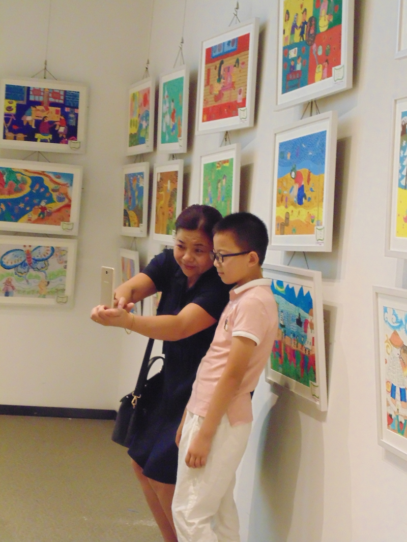 市圖書(shū)館大廳開(kāi)幕式人頭攢動(dòng),有來(lái)自喬諾美校的幾百名家長(zhǎng)學(xué)生,有業(yè)界同仁朋友,有慕名而來(lái)的觀眾,有公益班報(bào)名的家長(zhǎng)學(xué)生。大家都愉快地在展出的畫(huà)前合影留念