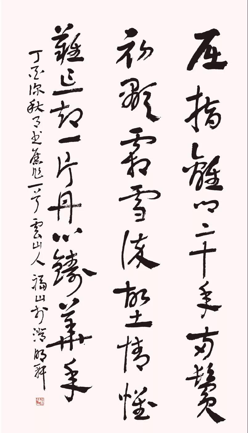 《回鄉偶感》 屈指離鄉二十年,兩鬢初見霜雪染。故土情懷難忘卻,一片丹心鑄華年。尺寸:69cm×138cm 材質:紙本水墨 年代:2017