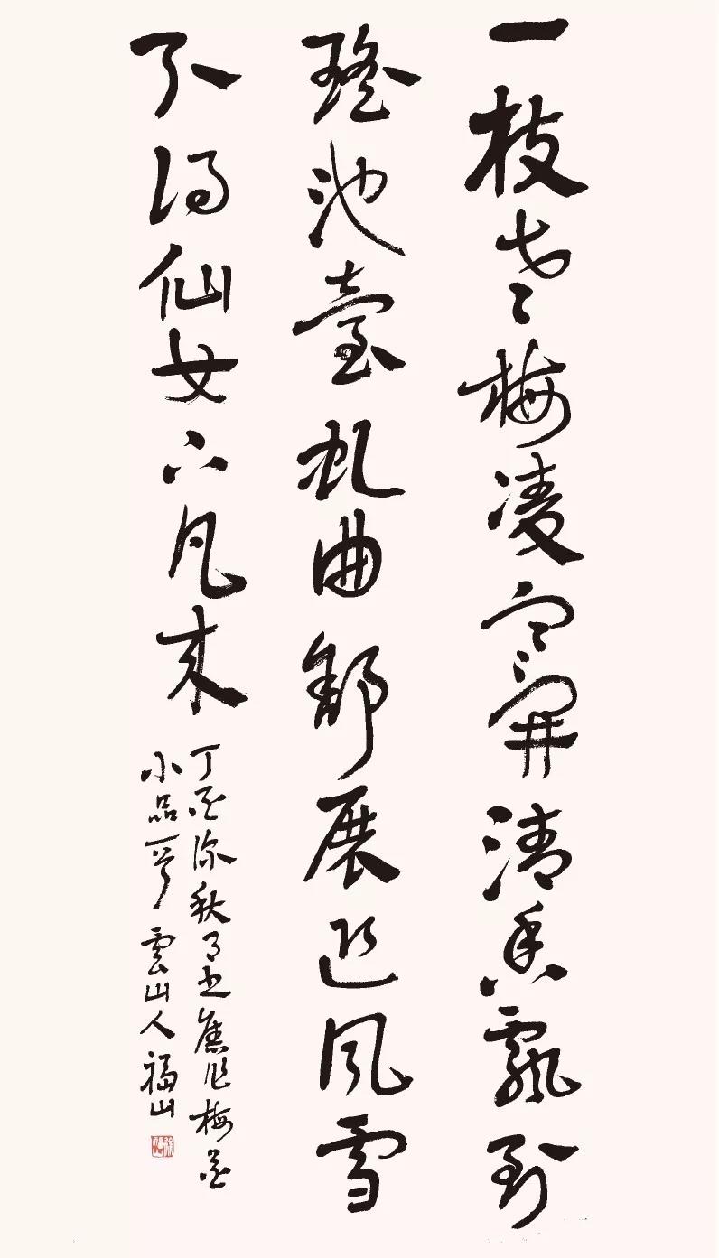 《題梅花小品》 一枝老梅凌寒開,清香飄到瑤池臺。虬曲舒展迎風雪,引得仙女下凡來。尺寸:69cm×138cm 材質:紙本水墨 年代:2017