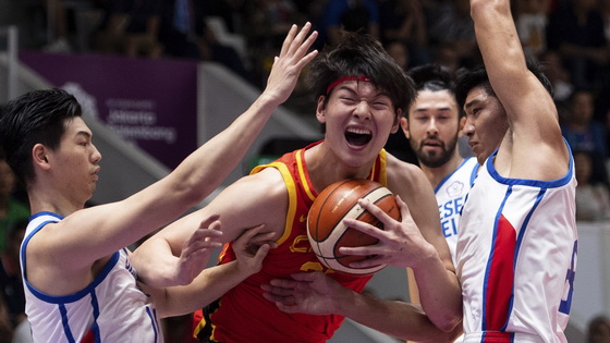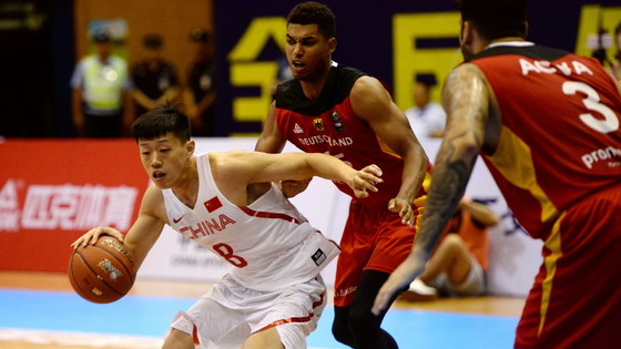 中國(guó)隊(duì)球員王哲林(中)在比賽中。新華社記者張金加攝