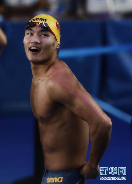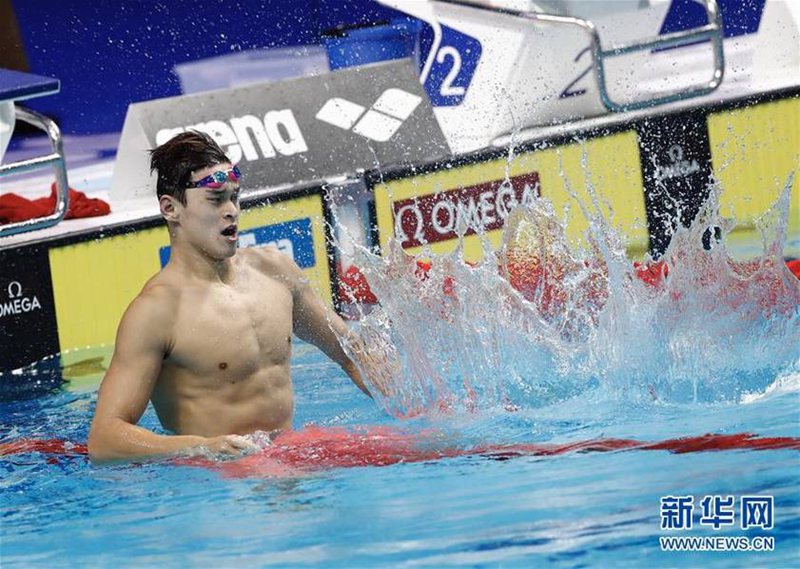 7月25日,孫楊在決賽后慶祝。當日,在匈牙利布達佩斯進行的第17屆國際泳聯游泳世錦賽游泳男子200米自由泳決賽中,中國選手孫楊以1分44秒39的成績奪冠。