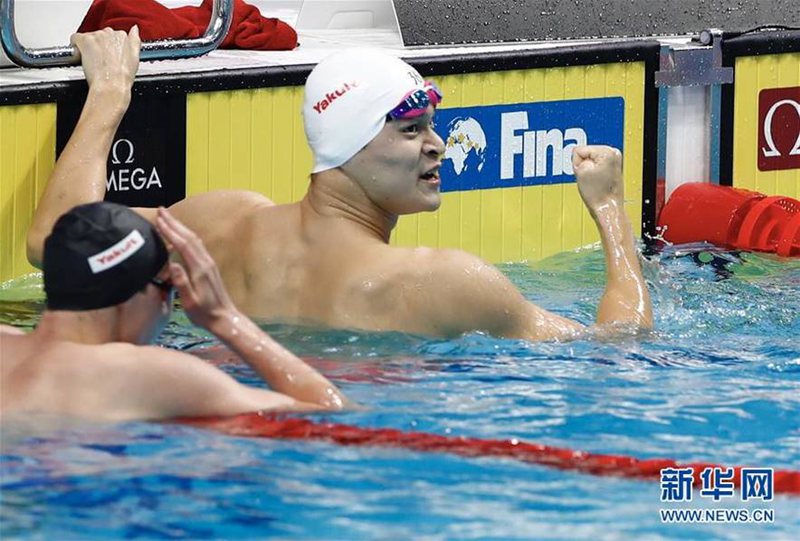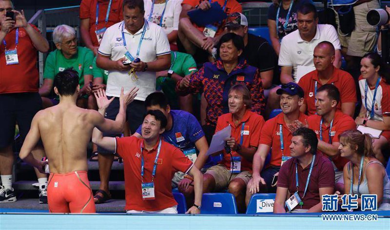 7月25日,孫楊(前左一)在決賽后接受祝賀。