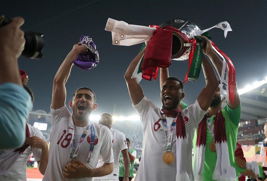 2月1日,卡塔爾隊(duì)在頒獎(jiǎng)儀式上慶祝奪冠。 當(dāng)日,在阿聯(lián)酋的阿布扎比舉行的2019亞洲杯足球賽決賽中,卡塔爾隊(duì)以3比1戰(zhàn)勝日本隊(duì),奪得冠軍。 新華社記者丁旭攝2月 ... [更多詳細(xì)]