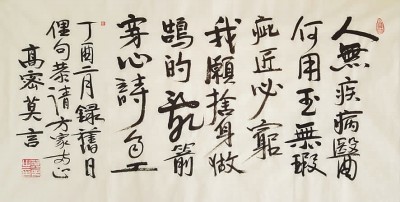 我認(rèn)為,一個(gè)真正的書(shū)法家,必須是一個(gè)不錯(cuò)的詩(shī)文聯(lián)句的創(chuàng)作者,如果一個(gè)人一輩子只寫(xiě)“天道酬勤”、“厚德載物”,只抄錄唐詩(shī)宋詞,而寫(xiě)不出一首基本中規(guī)中矩的詩(shī)詞,編不出一副大體工整的對(duì)聯(lián),這樣的人,充其量也就是個(gè)寫(xiě)字匠,無(wú)論頭上有多少名銜,也不能讓人服氣。