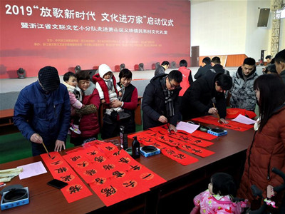 1月3日,浙江省書法家協會服務小分隊在杭州市蕭山區義橋鎮民豐村為農民寫福送春聯。2019年1月3日,浙江省2019文化進萬家活動在杭州市蕭山區義橋鎮民豐村拉開帷 ... [更多詳細]
