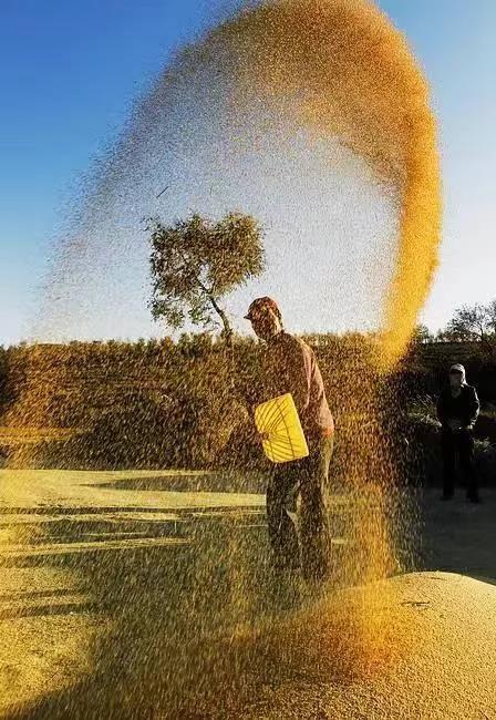 起風(fēng)了,人們開始揚場。數(shù)十萬斤麥子,被一锨锨揚到半空中,劃著好看的弧度,再落下,麥皮麥殼和麥粒就分開了,一直揚得雜質(zhì)全無,純凈金黃。
