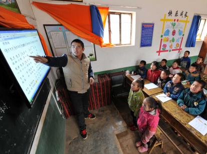 寧夏西海固地區(qū)涇源縣涇河源鎮(zhèn)底溝村教學(xué)點(diǎn)的老師利用多媒體教學(xué)設(shè)備給學(xué)生們上課。(新華社記者 彭昭之 2015年3月19日攝)