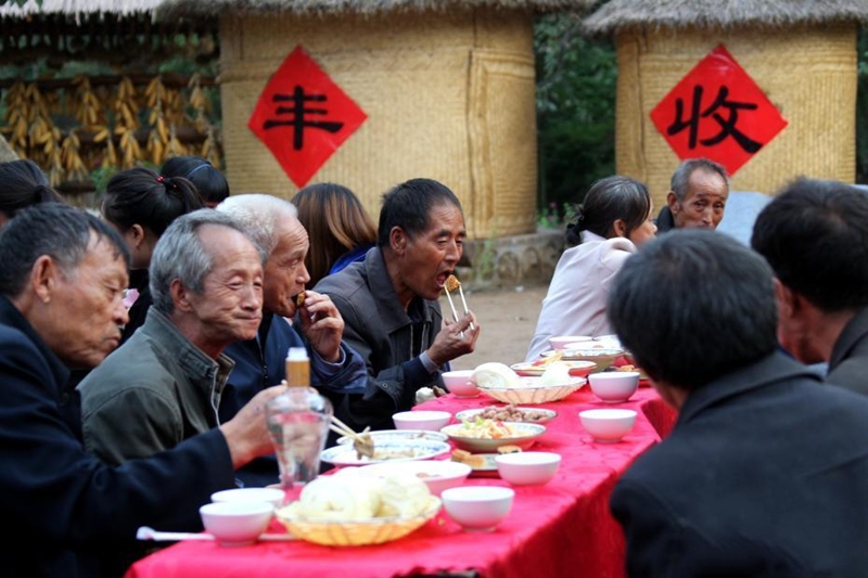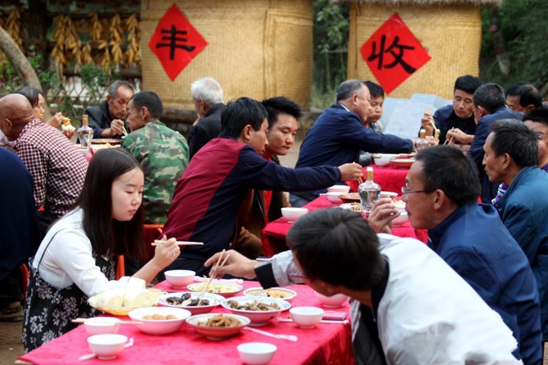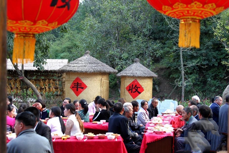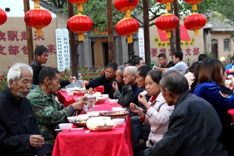 9月29日傍晚,國慶前夕,河南省盧氏縣新坪村張燈結彩,百余村民們圍坐于村委會門前的百草園廣場,他們拿出自家的拿手好菜,手工牛肉丸、熬炒柴雞、山水老豆腐、粉蒸紅薯葉、清炒香菇、清蒸南瓜等幾十樣的特色美食。聚在一起吃“百家宴”,話家長里短,擺放著美食的桌子圍成了巨大的“國慶”字樣,場面十分壯觀。