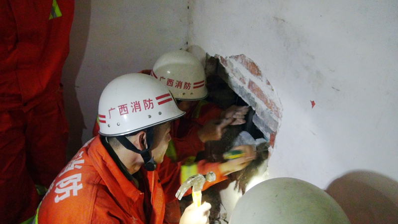 當天18時許,桂平市消防中隊接到報警:桂平市中沙鎮中和村一小孩卡在兩墻之間,無法出來,小孩哇哇直哭,家長無奈,情況緊急急需營救。接警后,桂平中隊立即出動1個搶險編隊2輛消防車、10名官兵趕赴現場救援。