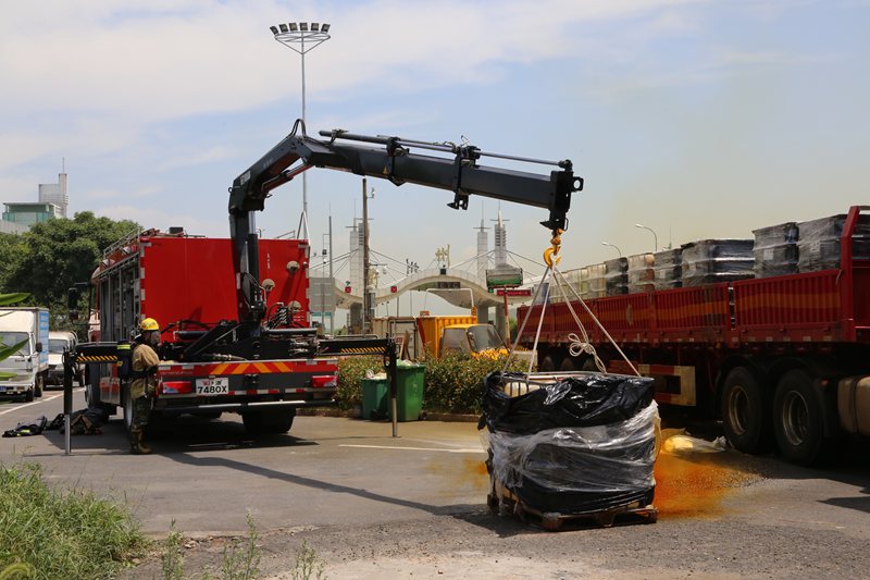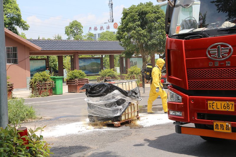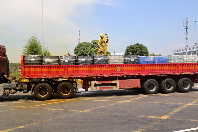 消防戰士穿上防化服,將泄漏的容器連上吊臂吊下,撒上生石灰對硝酸進行中和,通過一系列措施,泄漏物得到及時清理和妥善處置,事故車輛所載的硝酸,未對周邊環境造成的大面積污染和破壞。