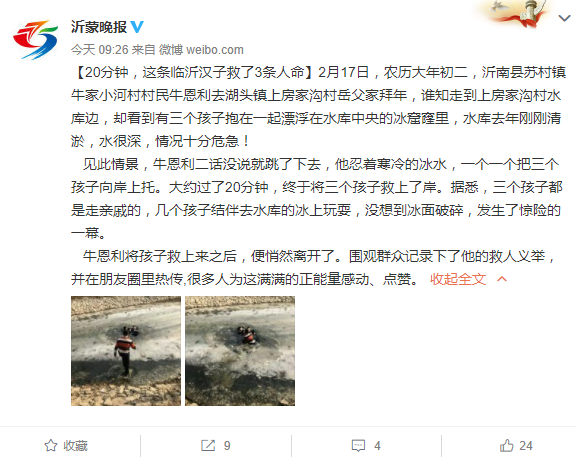 2月17日,農歷大年初二,山東沂南縣蘇村鎮牛家小河村村民牛恩利去湖頭鎮上房家溝村岳父家拜年,誰知走到上房家溝村水庫邊,卻看到有三個孩子抱在一起漂浮在水庫中央的冰窟窿里,水庫去年剛剛清淤,水很深,情況十分危急。見此情景,牛恩利二話沒說就跳了下去。