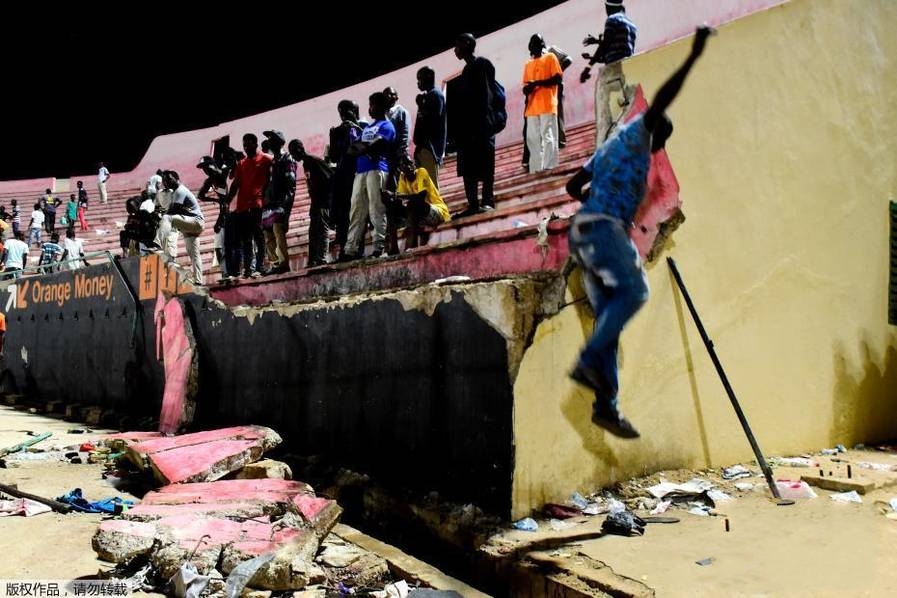 圖為球迷沖突過程中,球場的設施被破壞。 圖為發生坍塌的看臺墻壁。 現場一片混亂導致踩踏事件。